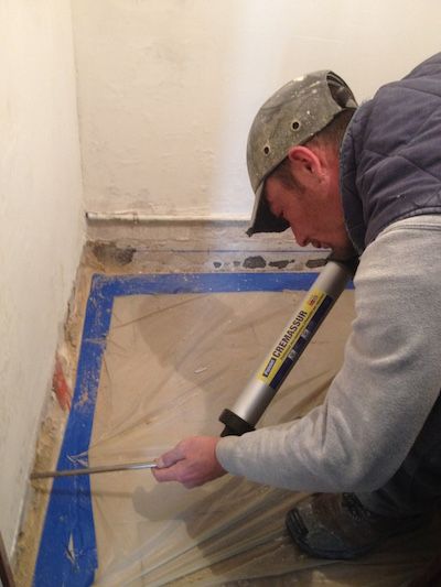 A l’aide d’un pistolet, le gel actif Assech’Mur va remplir les trous précédemment forés et se diffuser sur toute la longueur du mur.