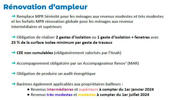 Depuis le 1er janvier 2024, le dispositif « MaPrimeRénov’ Parcours accompagné » (anciennement MaPrimeRénov’ Sérénité) se concentre avant tout sur les rénovations « d’ampleur » des habitations que l’on appelle « passoires énergétiques », soit les maisons avec un DPE (Diagnostic de Performance Énergétique) F ou G. Toutefois, le dispositif reste ouvert aux logements classés E ou D avec des aides financières moindres.