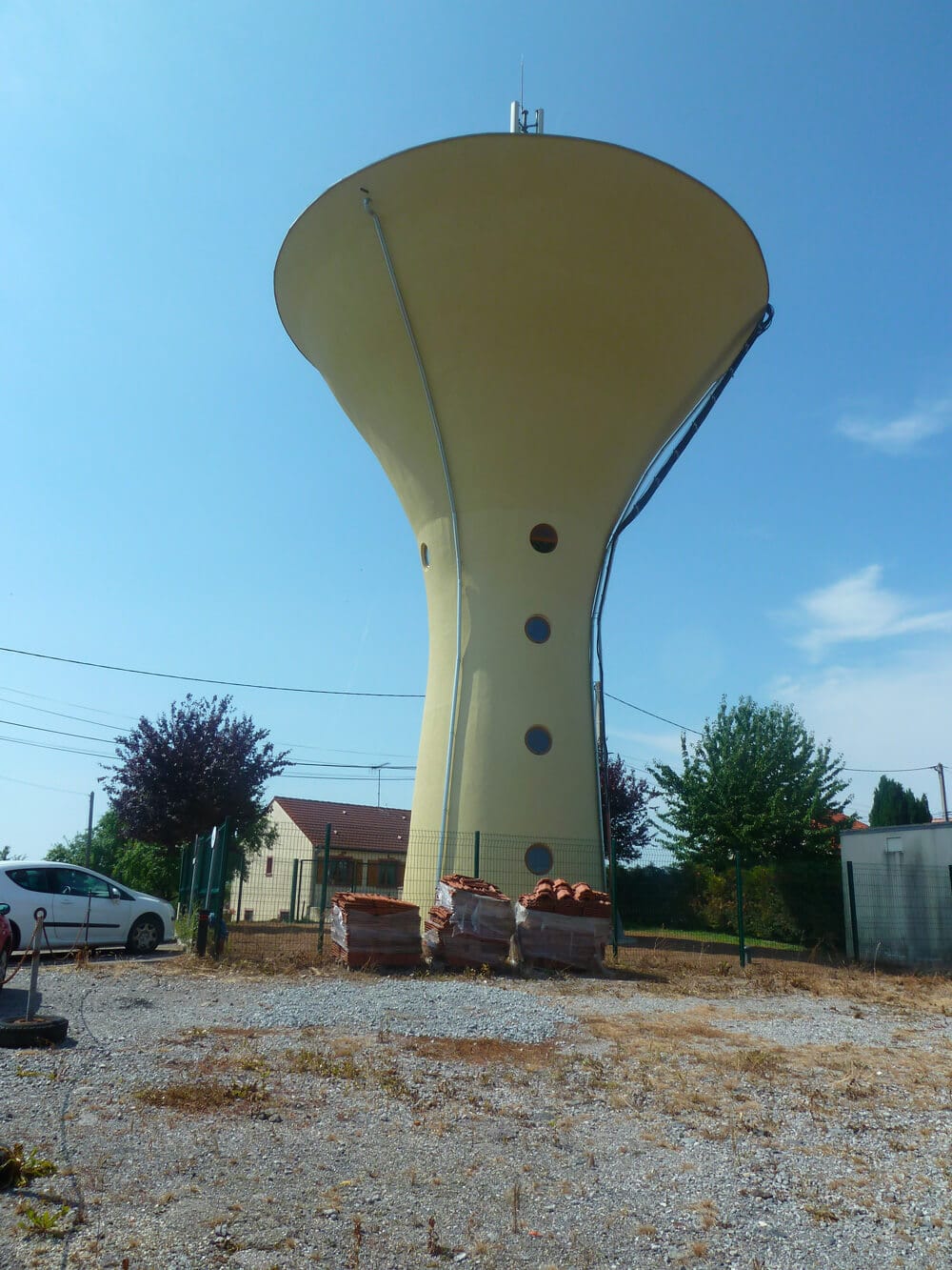 Isolation thermique extérieure du réservoir d’un château d’eau en panneaux de polystyrène 5 cm callé-chevillé, finition RPE et fût avec sous-couche.