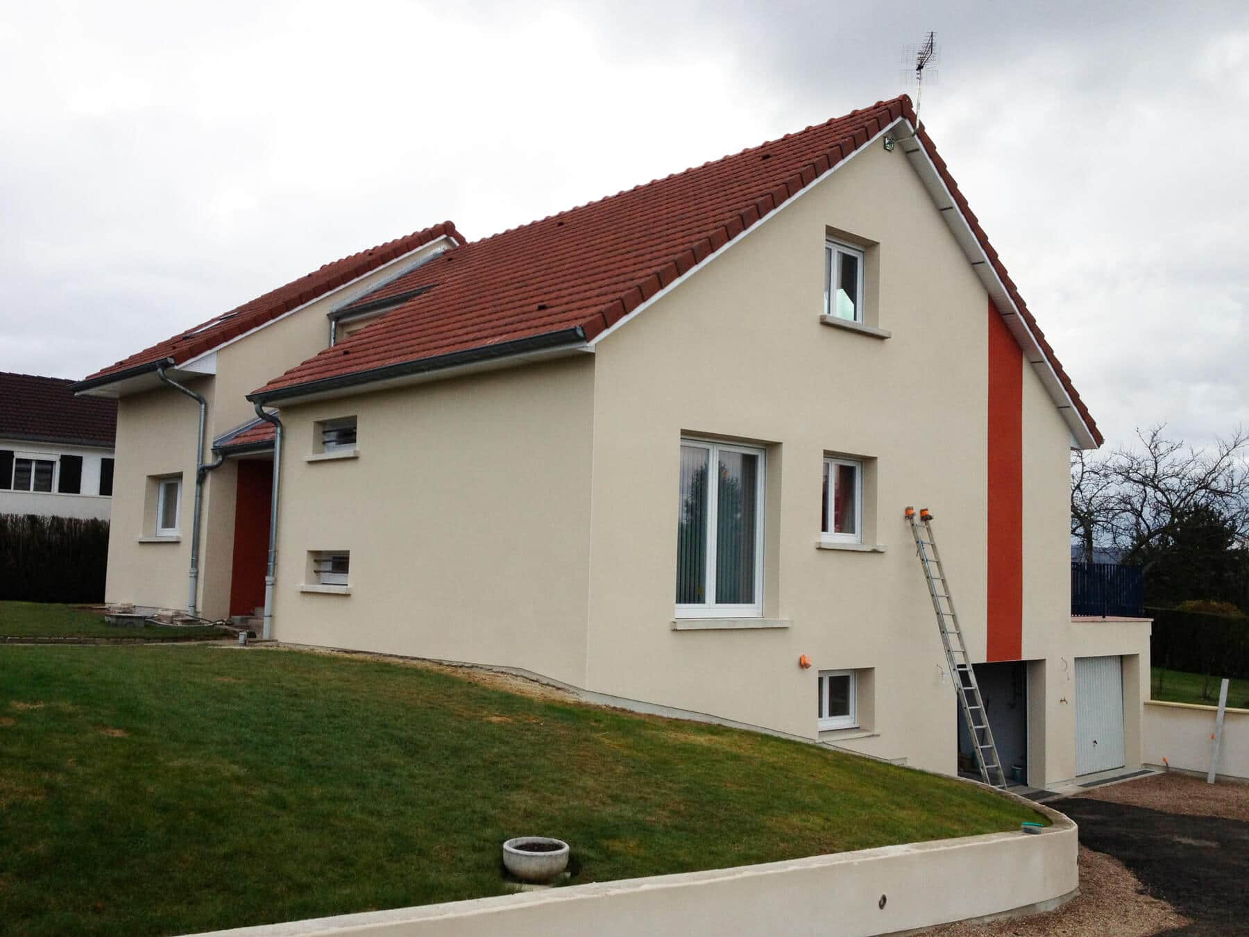 Enduiest Lorraine a réalisé la peinture des façades d’une maison à Bicqueley (54) : couleurs 001 et 327 grattée.
